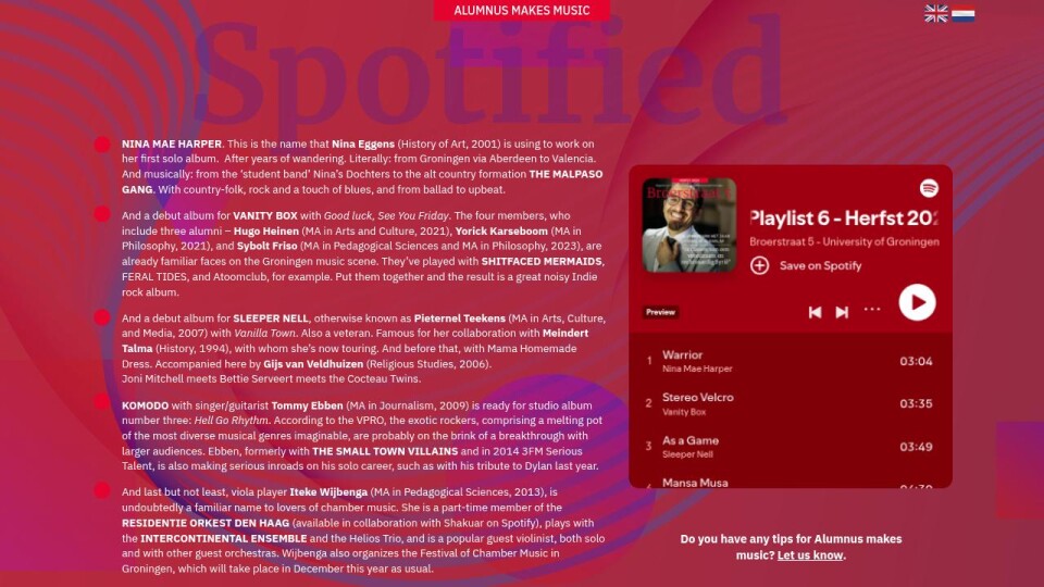 And last but not least, viola player Iteke Wijbenga (MA in Pedagogical Sciences, 2013), is undoubtedly a familiar name to lovers of chamber music. She is a part-time member of the RESIDENTIE ORKEST DEN HAAG (available in collaboration with Shakuar on Spotify), plays with the INTERCONTINENTAL ENSEMBLE and the Helios Trio, and is a popular guest violinist, both solo and with other guest orchestras. Wijbenga also organizes the Festival of Chamber Music in Groningen, which will take place in December this year as usual.