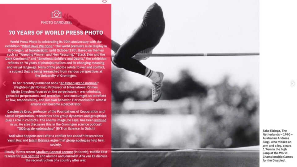 World Press Photo is celebrating its 70th anniversary with the exhibition “What Have We Done.” The world premiere is on display in Groningen, at Noorderlicht, until October 19th. Based on themes such as “Weeping Women and Men Rescuing,” “Black Skin and the Dark Continent,” and “Emotional Soldiers and Debris,” the exhibition reflects on 70 years of photojournalism and its changing meaning and visual language. Many of the photos relate to war and conflict, a subject that is being researched from various perspectives at the University of Groningen.
