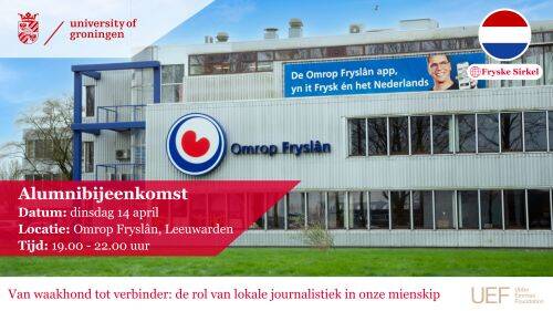 Op dinsdagavond 14 april organiseert de Fryske Alumni Sirkel een alumnibijeenkomst over de rol van lokale en regionale journalistiek in Friesland. We zijn te gast bij Omrop Fryslân. Met sprekers Yael de Haan – bijzonder hoogleraar Lokale Publieke Omroepen, alumna Houkje Rijpstra – directeur Omrop Fryslân en Ingrid Spijkers – hoofdredacteur Omrop Fryslân.