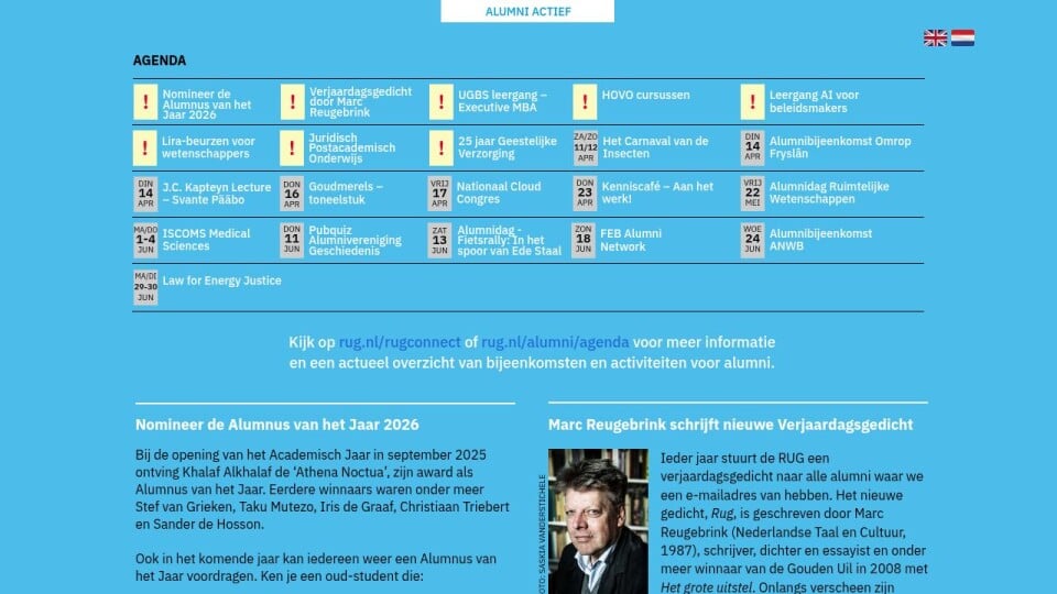 Geef dan vóór 15 april 2026 je nominatie met motivatie door via alumni@rug.nl. Meer informatie: rug.nl/alumni/alumnusvanhetjaar